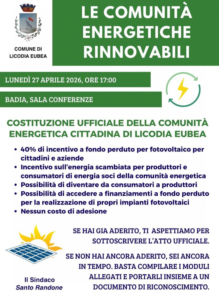 Il Comune di Licodia Eubea invita cittadini e imprese a partecipare alla ๐ณ๐ถ๐ฟ๐บ๐ฎ ๐ฑ๐ฒ๐น๐น๐ฎ ๐ฐ๐ผ๐๐๐ถ๐๐๐๐ถ๐ผ๐ป๐ฒ ๐๐ณ๐ณ๐ถ๐ฐ๐ถ๐ฎ๐น๐ฒ ๐ฑ๐ฒ๐น๐น๐ฎ ๐๐ผ๐บ๐๐ป๐ถ๐๐ฎฬ ๐๐ป๐ฒ๐ฟ๐ด๐ฒ๐๐ถ๐ฐ๐ฎ ๐ฐ๐ถ๐๐๐ฎ๐ฑ๐ถ๐ป๐ฎ.