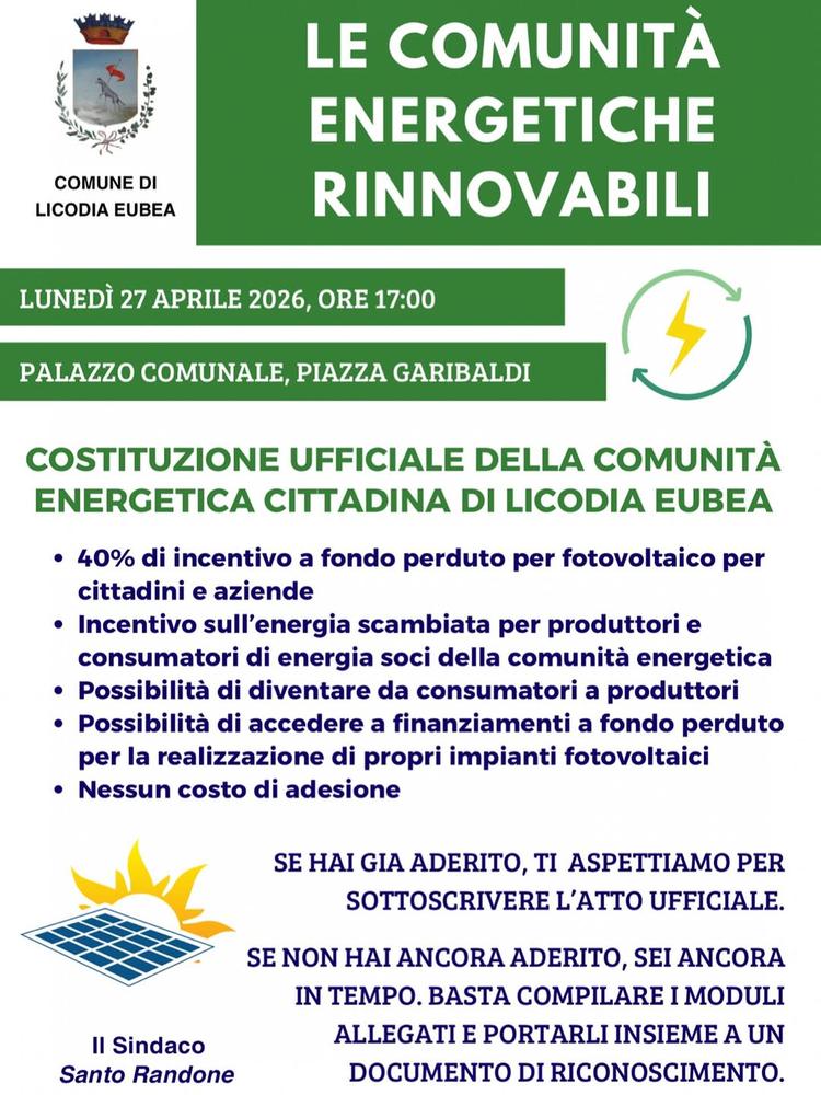 Il Comune di Licodia Eubea invita cittadini e imprese a partecipare alla ๐ณ๐ถ๐ฟ๐บ๐ฎ ๐ฑ๐ฒ๐น๐น๐ฎ ๐ฐ๐ผ๐๐๐ถ๐๐๐๐ถ๐ผ๐ป๐ฒ ๐๐ณ๐ณ๐ถ๐ฐ๐ถ๐ฎ๐น๐ฒ ๐ฑ๐ฒ๐น๐น๐ฎ ๐๐ผ๐บ๐๐ป๐ถ๐๐ฎฬ ๐๐ป๐ฒ๐ฟ๐ด๐ฒ๐๐ถ๐ฐ๐ฎ ๐ฐ๐ถ๐๐๐ฎ๐ฑ๐ถ๐ป๐ฎ.
