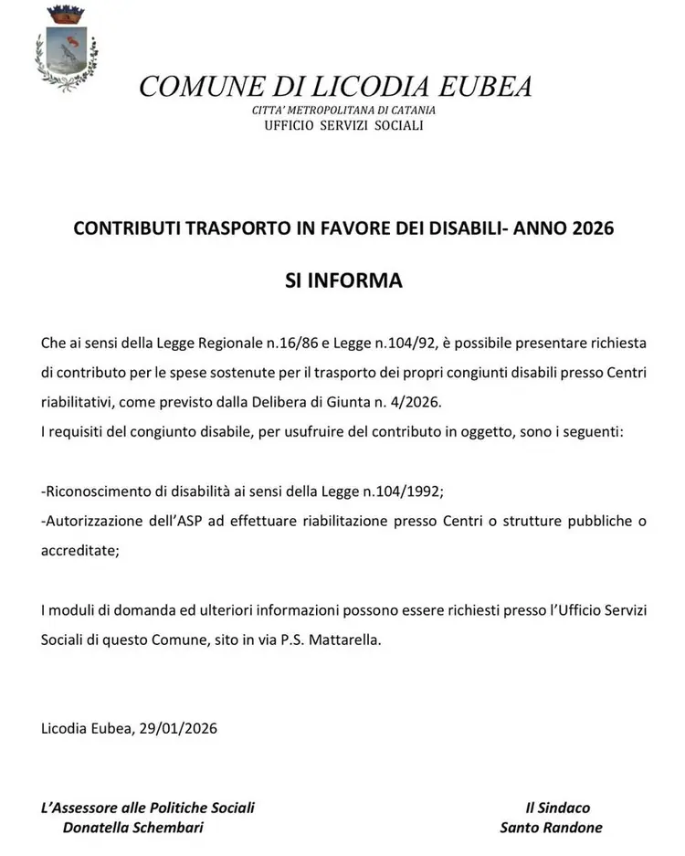 CONTRIBUTI TRASPORTO IN FAVORE DEI DISABILI- ANNO 2026