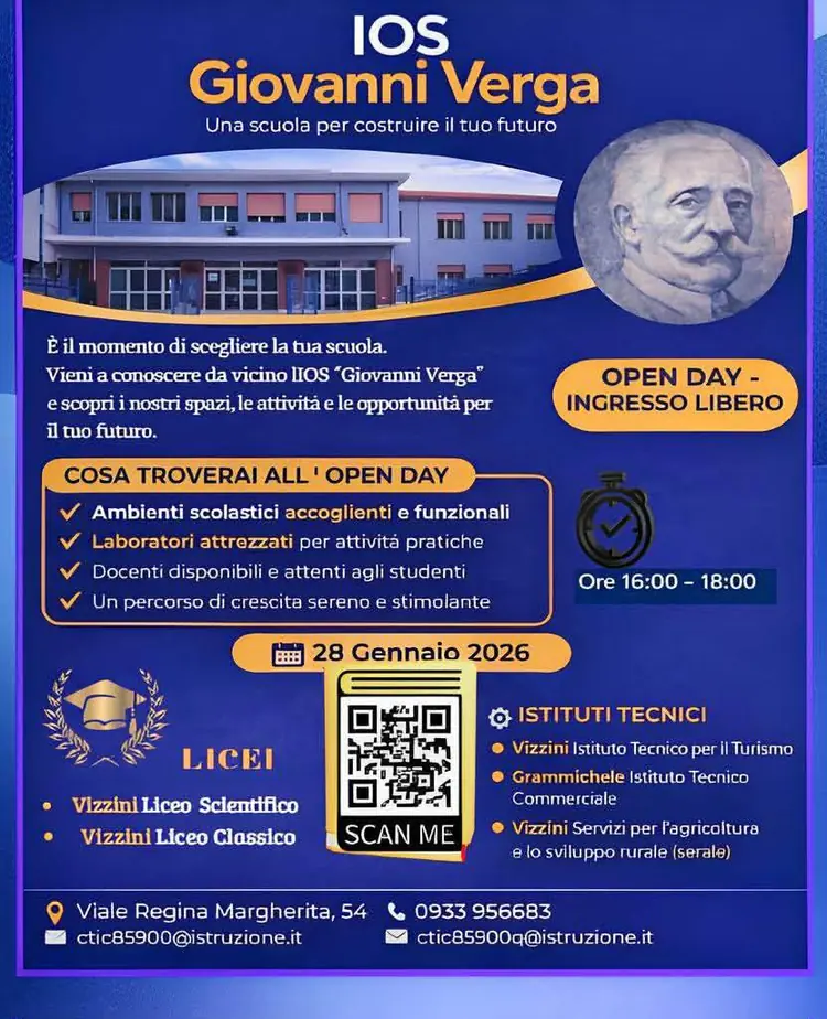 📢𝐎𝐩𝐞𝐧 𝐃𝐚𝐲: 𝐢𝐥 𝐭𝐮𝐨 𝐟𝐮𝐭𝐮𝐫𝐨 𝐢𝐧𝐢𝐳𝐢𝐚 𝐝𝐚 𝐪𝐮𝐢! La scelta della scuola superiore è un passo importante. L'I.O.S. "G. Verga" apre le porte a studenti e famiglie in occasione dell’ 𝐎𝐩𝐞𝐧 𝐃𝐚𝐲, una giornata pensata per conoscere da vicino la nostra realtà. 🗓️ Il 𝟐𝟖 𝐠𝐞𝐧𝐧𝐚𝐢𝐨 dalle 𝟏𝟔:𝟎𝟎 𝐚𝐥𝐥𝐞 𝟏𝟖:𝟎𝟎 presso la sede